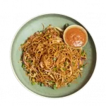 Stir fried noodles tossed with vegetables herbs and spices served with sauce.